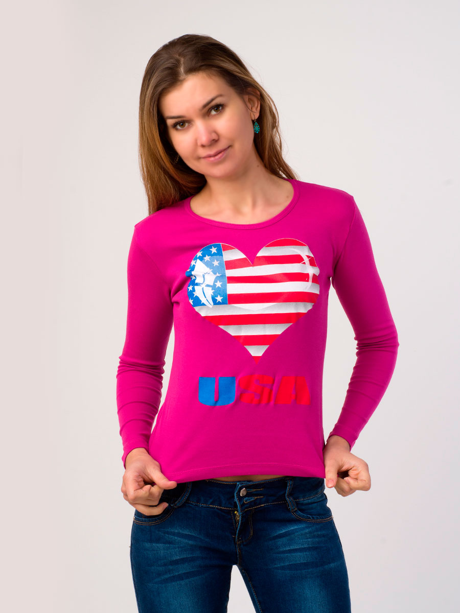 Лонгслив с оригинальным принтом "USA сердце". Круглый вырез, длиный рукав, 100% хлопок.