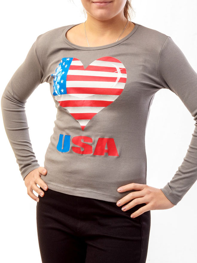Лонгслив с оригинальным принтом "USA сердце". Круглый вырез, длиный рукав, 100% хлопок.